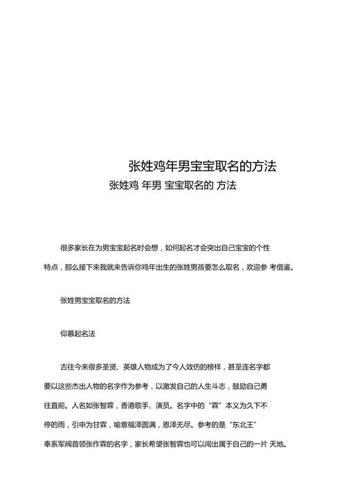 2017年鸡年张姓婴儿名结论2017年是“鸡”年,很多家庭可能会给新生儿取名。关于张姓宝宝的名字,不仅可以用传统的名字,还可以参考一些推荐的好名字,比如“张晓红”、“张璐明”、“张吉祥”、“张正雅”、“张乐善”、“张和合”等。总之,命名很重要,要仔细考虑,为宝宝选择最好的名字,这样才能给宝宝未来的生活带来好运!